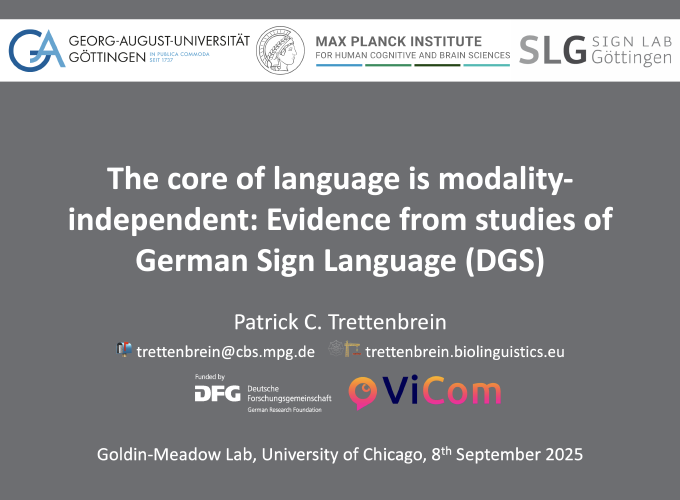 The capacity for language enables humans to flexibly link meaning to sound or sign by means of grammar. Significantly, the computations underlying this ability appear to be fundamentally abstract and therefore at least to an extent independent of the modality of language use (sign or speech). In this talk, I will present functional and structural data from magnetic resonance imaging with deaf native signers of German Sign Language (DGS) to argue that core aspects of language processing are subserved by the same primarily left-hemispheric fronto-temporal network, regardless of whether deaf native signers are using a sign language or hearing controls process their native spoken language (auditorily or in written form). Differences in white-matter pathways interconnecting language-relevant cortical regions resulting from deafness and sign language acquisition can primarily be observed only in the right hemisphere. Beyond these recent neural data, I will also discuss possible universals in adjustment behaviours when participants are processing a (sign) language they do not understand as identified in recent eye-tracking work, as well as some preliminary insights in modality-specific phonetic and morphophonological properties of the major lexical categories (i.e., nouns and verbs) in DGS based on classical linguistic elicitation data.
